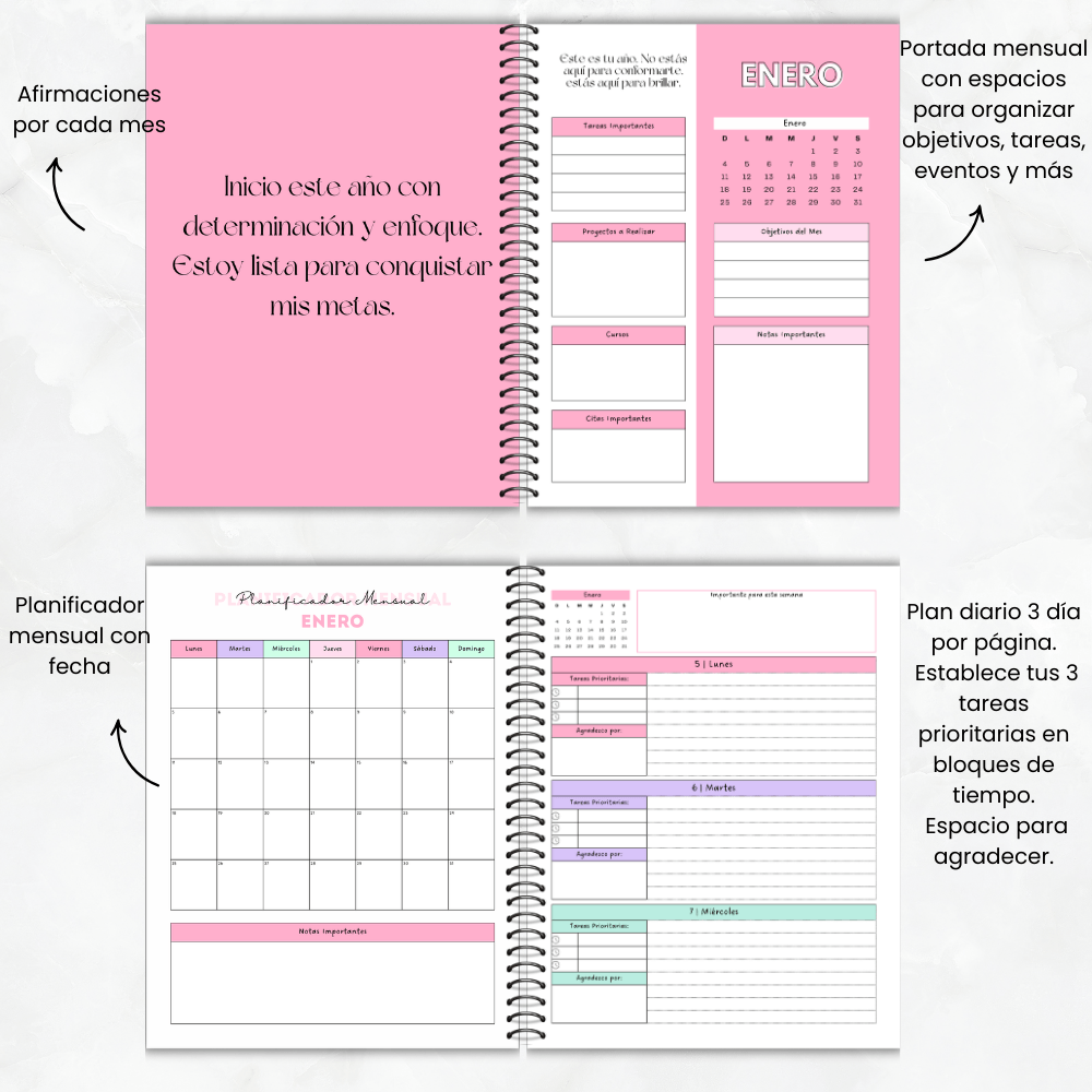Imagina despertar cada mañana sabiendo exactamente hacia dónde vas. Con metas claras. Con hábitos alineados. Con espacio para agradecer, soñar y crecer.